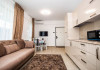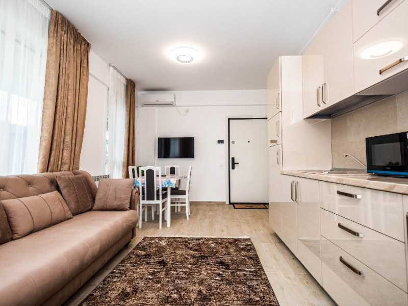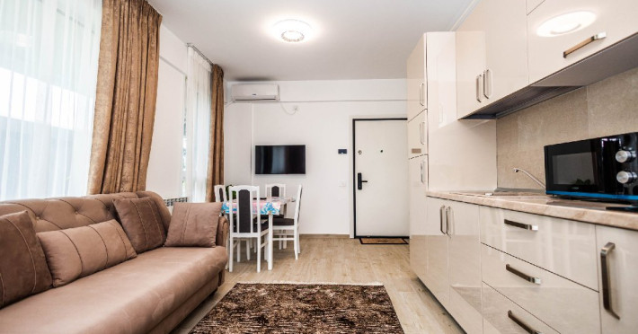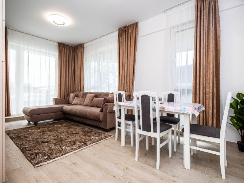 Livingul open space este luminos si primitor, echipat cu o canapea extensibila confortabila, perfecta pentru odihna sau pentru gazduirea oaspetilor suplimentari. Zona de zi comunica direct cu bucataria si zona de luat masa, creand un spatiu ideal pentru petrecerea timpului impreuna.
