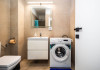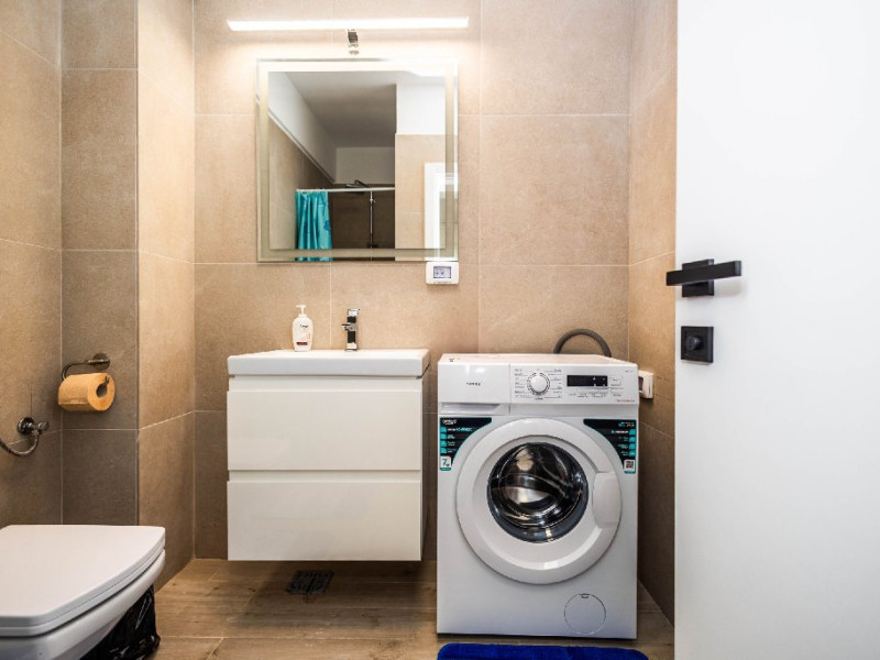 Baia este moderna si functionala, dotata cu dus spatios, masina de spalat si tot ce este necesar pentru confortul tau, indiferent de durata sejurului.