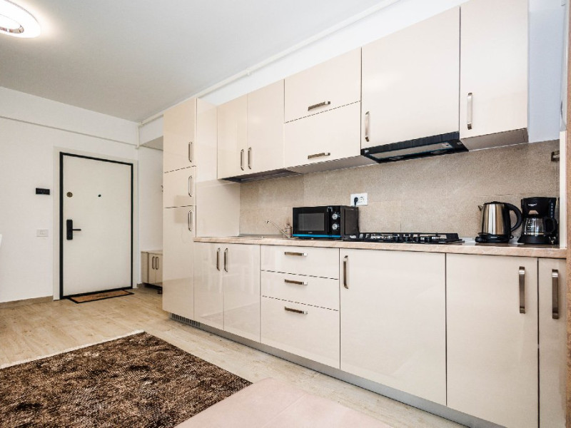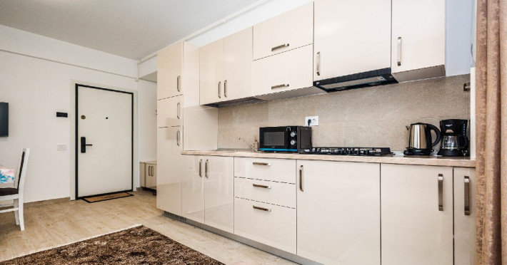 Bucataria este complet utilata si gandita pentru a raspunde tuturor nevoilor de zi cu zi. Este dotata cu plita, cuptor cu microunde, prajitor de paine, aparat de cafea, frigider, chiuveta, dulapuri si toate ustensilele necesare pentru prepararea si servirea meselor. In completare, exista o masa de dining cu scaune, perfecta pentru mic dejunuri relaxante sau cine in familie.