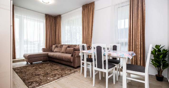 Apartamentul este spatios , oferind acces direct la o terasa privata cu masa si scaune, perfecta pentru momente de liniste in aer liber. Designul modern si atmosfera primitoare contribuie la o experienta de cazare placuta.