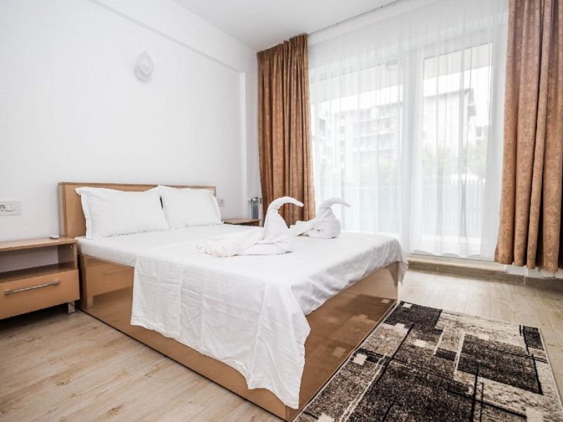 Dormitorul este amenajat cu un pat matrimonial spatios si un dulap generos pentru depozitarea hainelor si a bagajelor, astfel incat sa pastrezi totul organizat pe durata sederii.