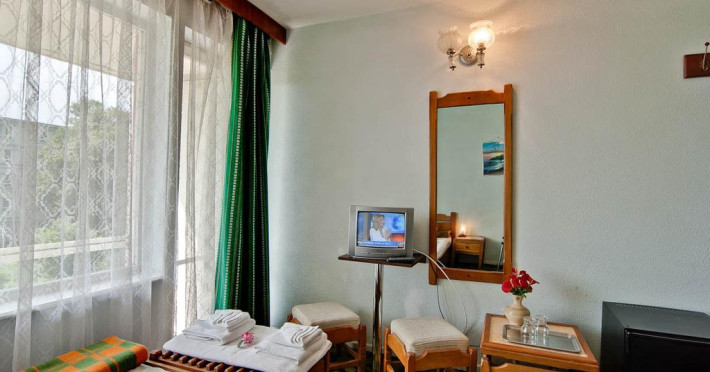 Este situat pe faleza, la 50 m de plaja , 1km de gara si de centrul statiunii. Facilitati hotel: restaurant (capacitate 288 de locuri), receptie 24 de ore, parcare. Hotelul dispune de 112 camere duble (parter+3 etaje). Facilitati camere: paturi twin, baie cu dus, balcon (doar unele camere), TV cablu, frigider (la cerere).