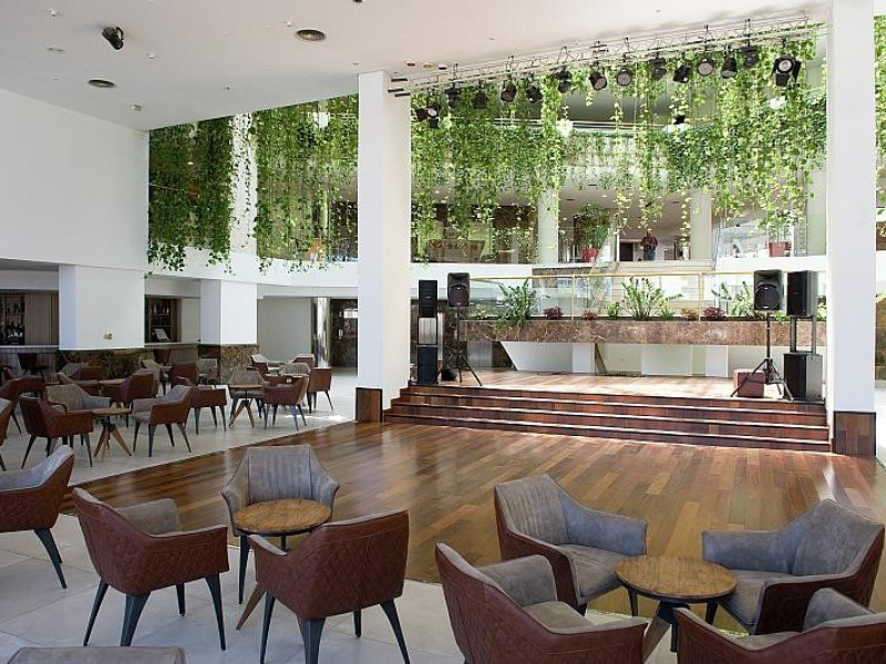Hotelul ofera un total de 308 camere intr-o cladire cu trei etaje. Oaspetii au acces la un hol de intrare cu receptie, un colt de internet (contra cost) si conexiune la internet Wi-Fi gratuit in zonele comune, un restaurant, un bar cu pian, 4 sali de conferinte, un club pentru copii (copii 4-12 ani). vechi), babysitting (la comanda contra cost), servicii medicale, servicii de spalatorie, parcare in garaj cu plata. In gradina exista 2 piscine mari (una incalzita in lunile de iarna), o piscina pentru copii, un parc Magic (zona pentru copii pentru copii), terase la soare cu sezlonguri si umbrele, un bar langa piscina. Oaspetii pot apela la serviciile centrului SPA (1.200 m2, sauna, masaje, jacuzzi), care ofera programe individuale in functie de dorintele si nevoile clientului (circuit de masaj, proceduri medicale si cosmetice, masaje, impachetari etc.). Echipa de animatie pregateste evenimente sportive si de divertisment in timpul zilei, programe de seara si spectacole cu muzica live.