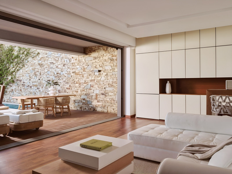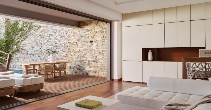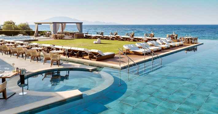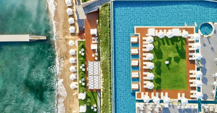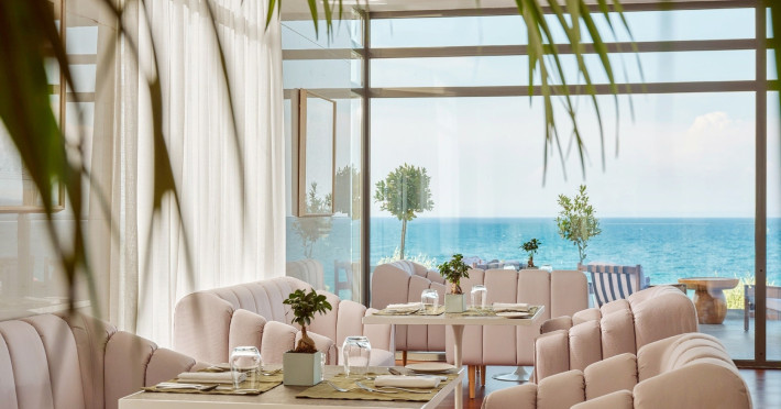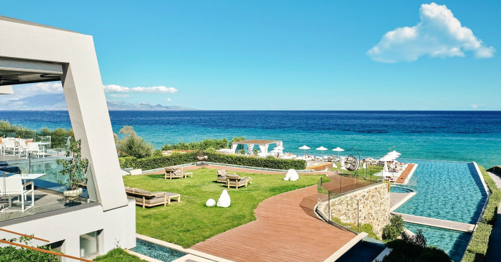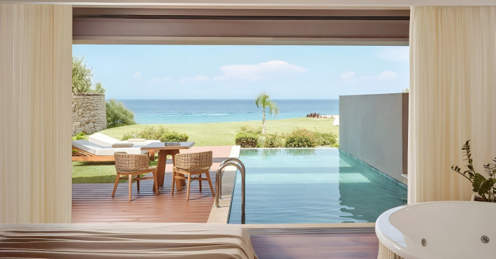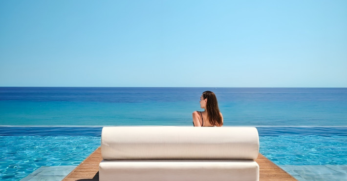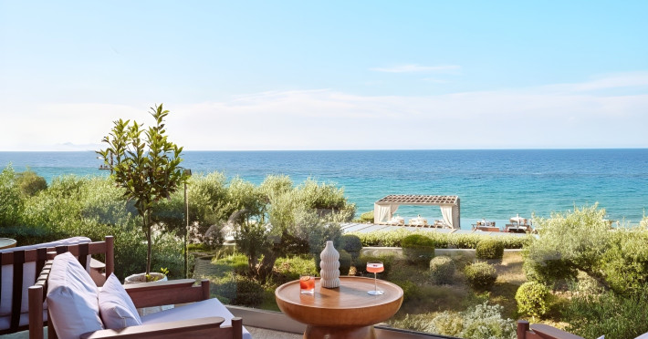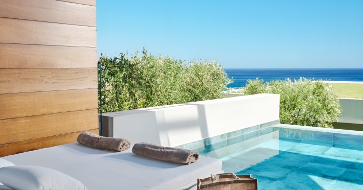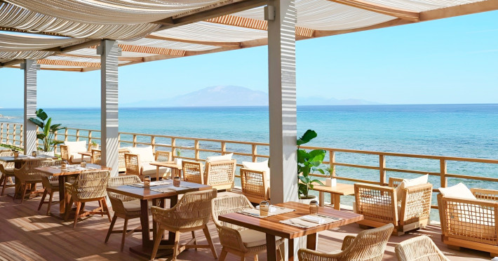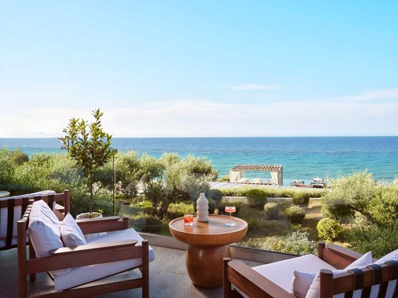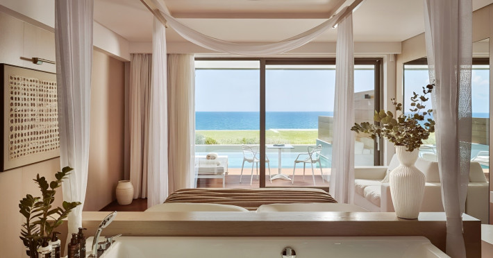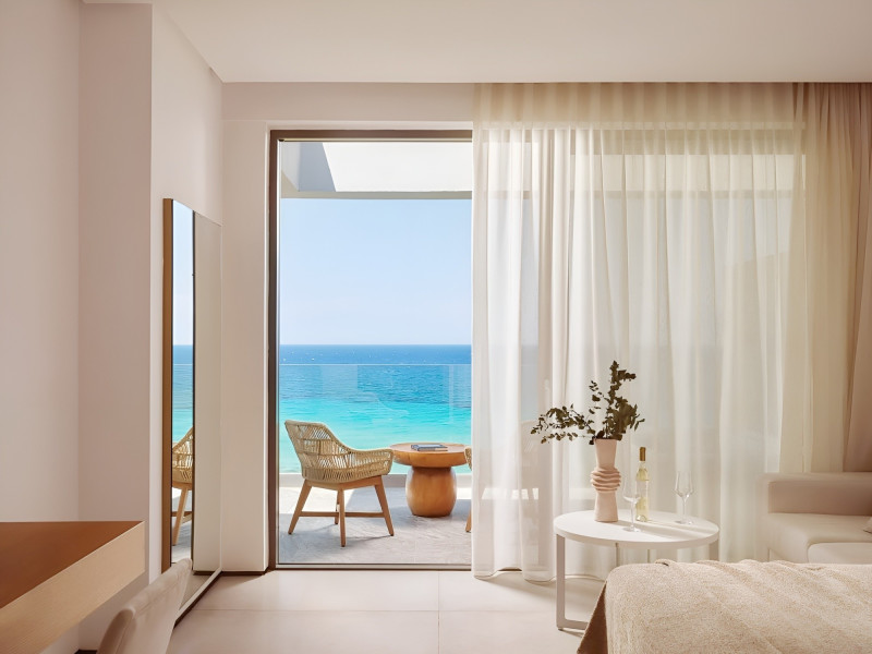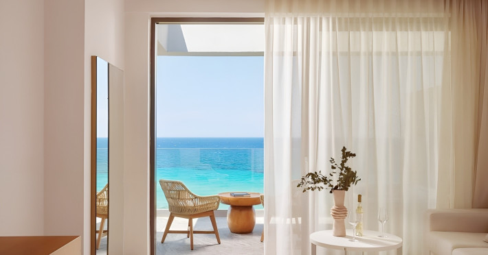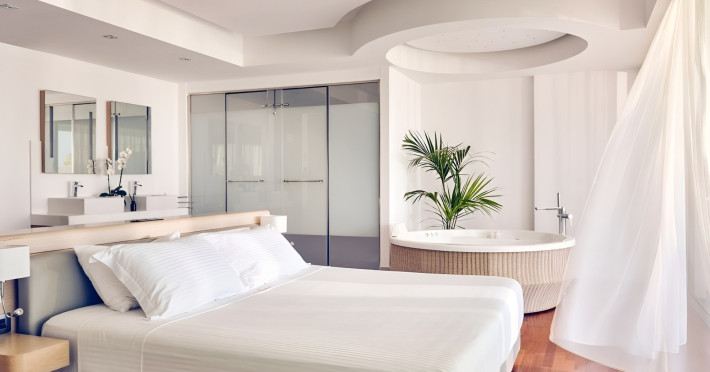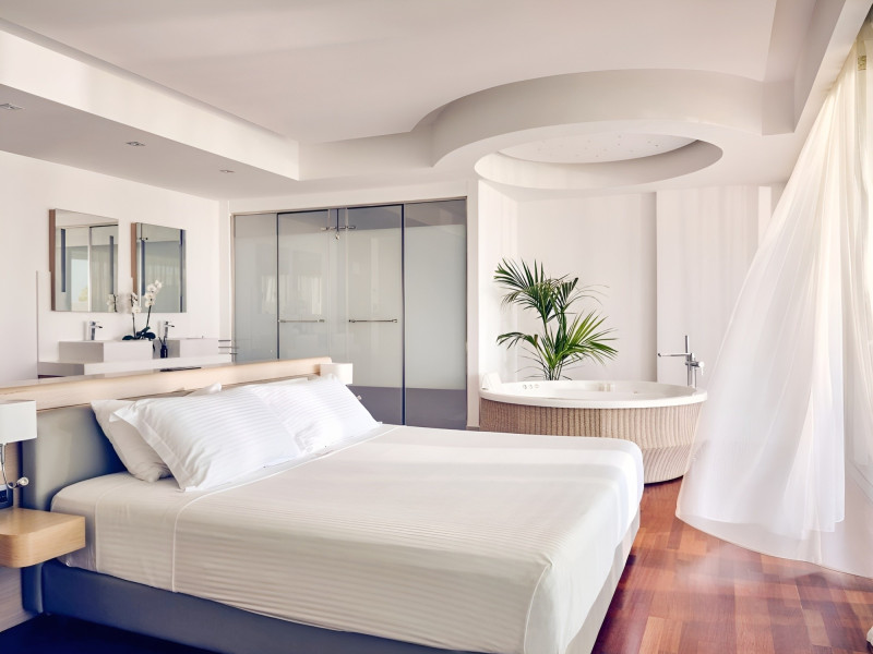 Suite, vedere la mare: baie/toaleta (uscator de par), aer conditionat, minibar, balcon sau terasa, fier si masa de calcat la cerere, vedere la mare. 45m2