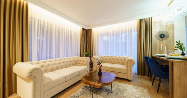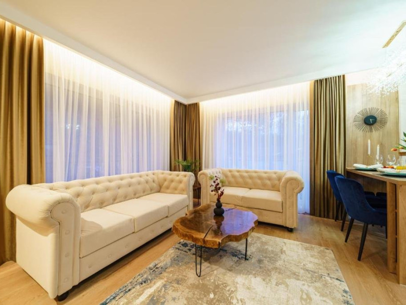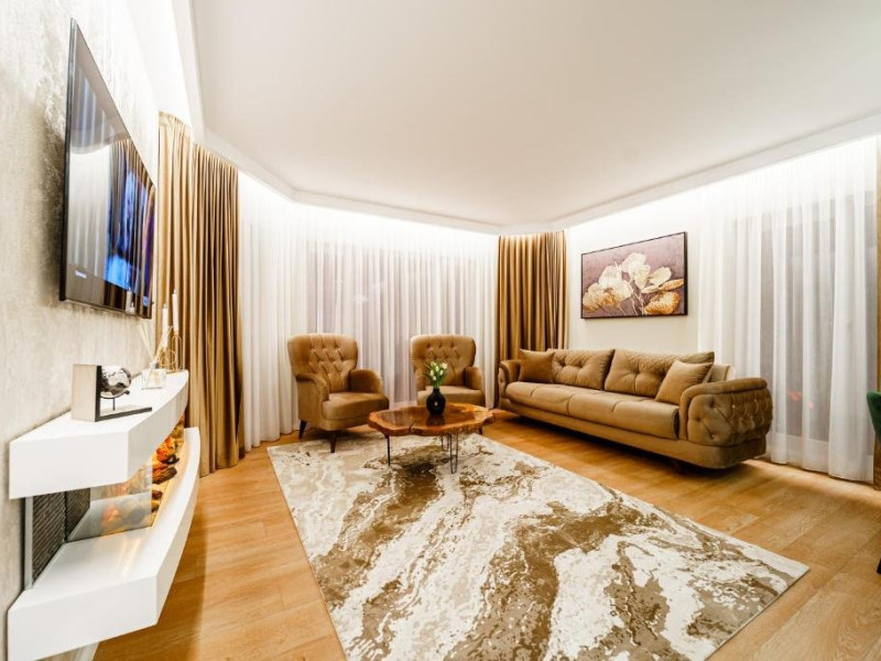 Livingul spatios te intampin cu o atmosfer cald si primitoare: canapele luxoase, mas de cafea din lemn de nuc, TV LCD si un semineu electric care adaug o not de rafinament, lux si confort. Zona de dining open-space este ideal pentru mese in familie sau seri plcute intre prieteni.