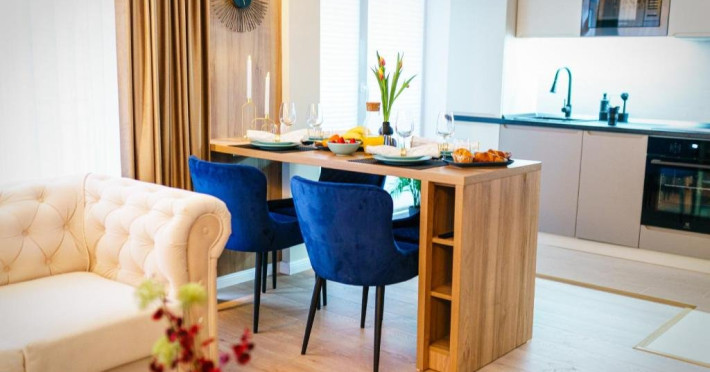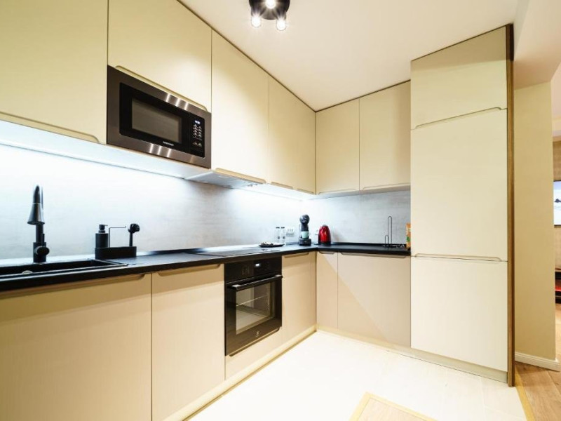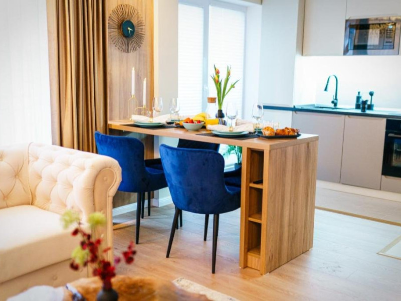 Buctria complet mobilat si utilat iti ofer libertatea si confortul de acas, fiind echipat cu masin de splat vase, cuptor clasic si cuptor cu microunde, frigider, aparat de cafea, fierbtor de ceai si toate ustensilele necesare pentru a putea gati preparate delicioase.