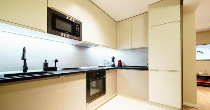 Buctria modern este dotat cu toate facilittile necesare pentru a-ti oferi independenta si confortul de acas: masin de splat vase, frigider cu congelator, cuptor clasic si cuptor cu microunde, aparat de cafea, fierbtor de ap si toate accesoriile indispensabile. Apartament cu 3 camere a Spatiu, elegant si intimitate la Prestige Apart Hotel Brasov