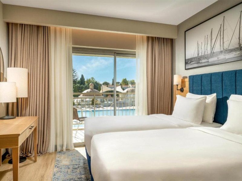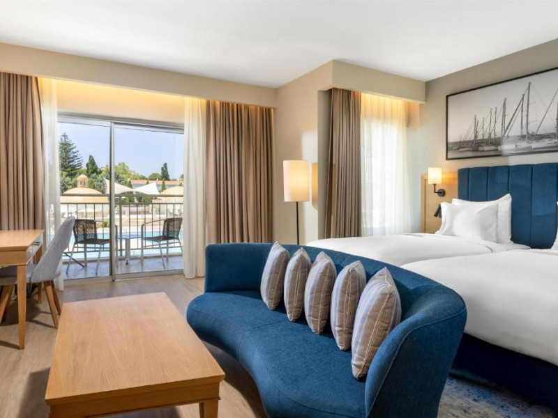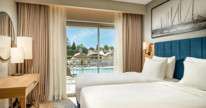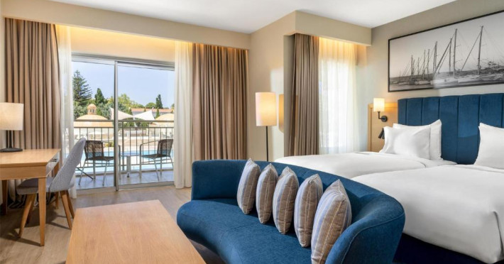 Camerele cu aer condiționat sunt decorate in tonuri pastelate relaxante. Fiecare cameră are TV cu ecran plat cu canale prin satelit și balcon privat. Unele camere oferă vedere la Marea Egee.