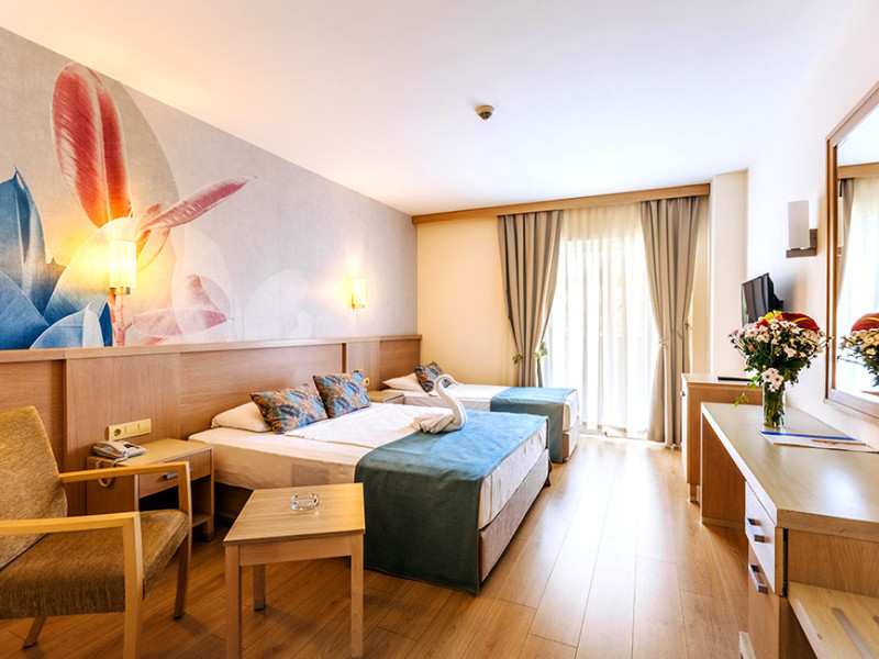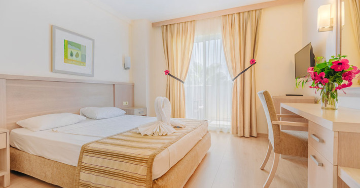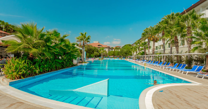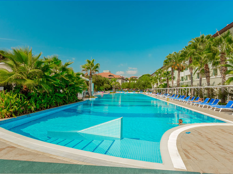 Acesta a fost construit in anul 2005 si se intinde pe o suprafata totala de 70 000 m2, ultima renovare a avut loc in anul 2016. Hotelul are opt cladiri cu patru nivele cu 375 standard room si 125 family room cu doua camere. Hotelul ofera oaspetilor un restaurant cu meniu dietetic, vegetarian, cinci baruri, doua piscine exterioare, cinci tobogane, medic, coafor, lanturi de magazine, spalatorie, sala de conferinte (100 pers.), trei terenuri de fotbal, internet WiFi in hol. Alte facilitati: baie turceasca, sauna, jacuzzi, sala de fitness, aerobic, aqua aerobic, volei pe plaja, baschet, 2 terenuri de tenis cu suprafata dura, tenis de masa, darts, animatie, muzica live. Plaja este privata cu nisip.La piscina si pe plaja: umbrele, sezlonguri si saltele sunt gratuite.