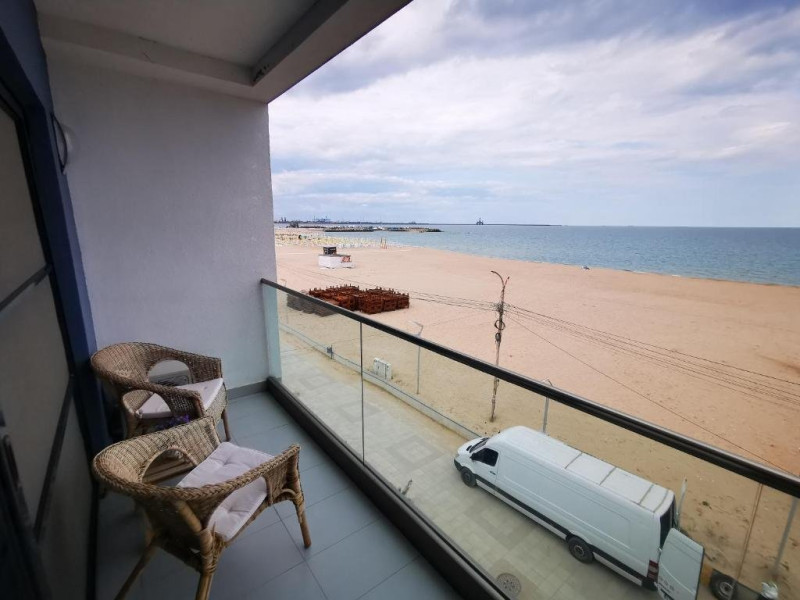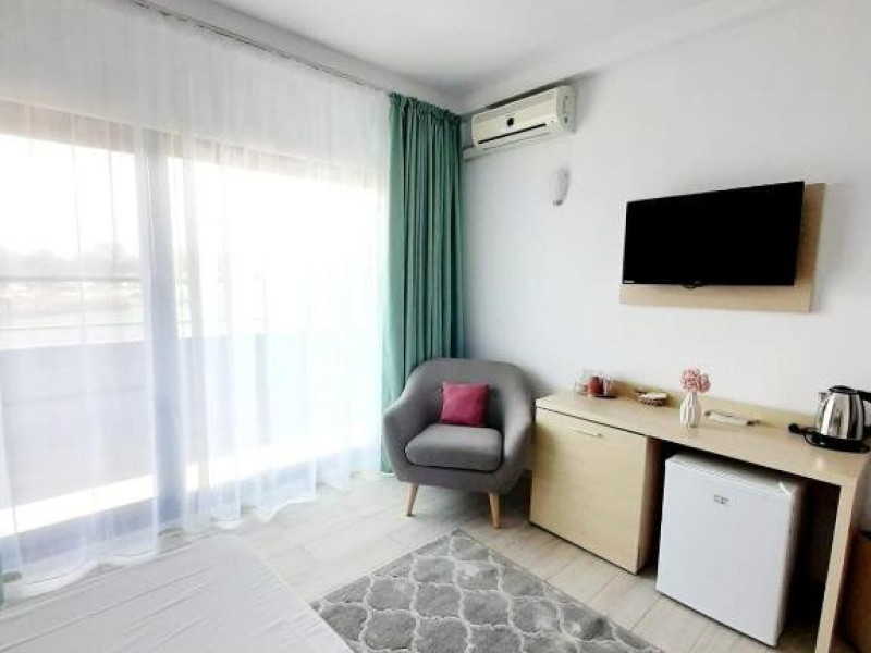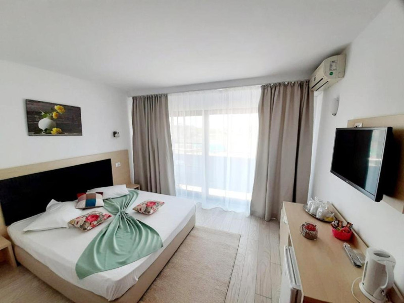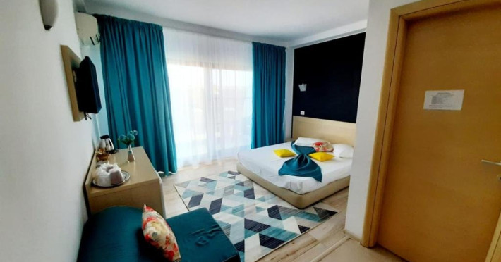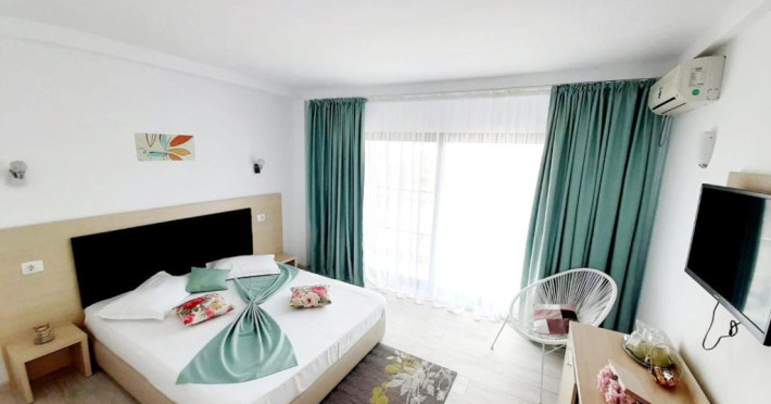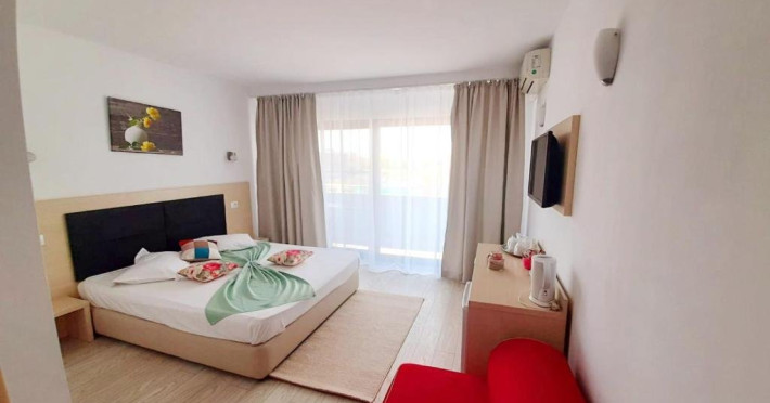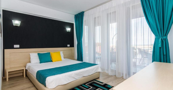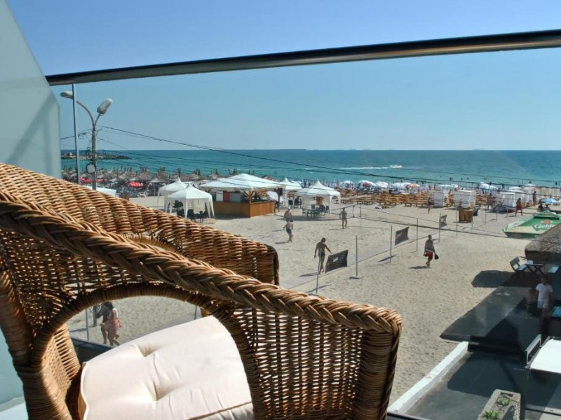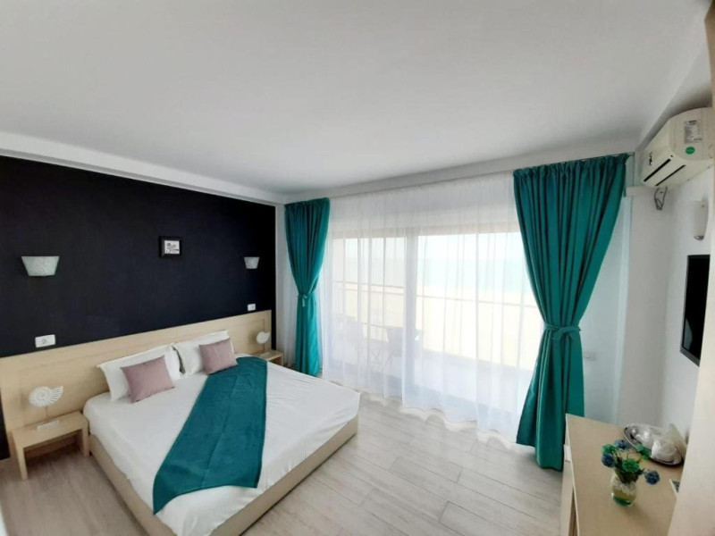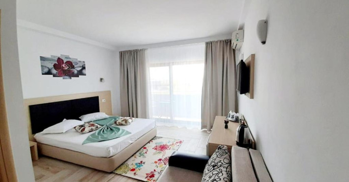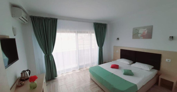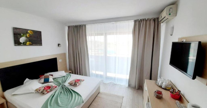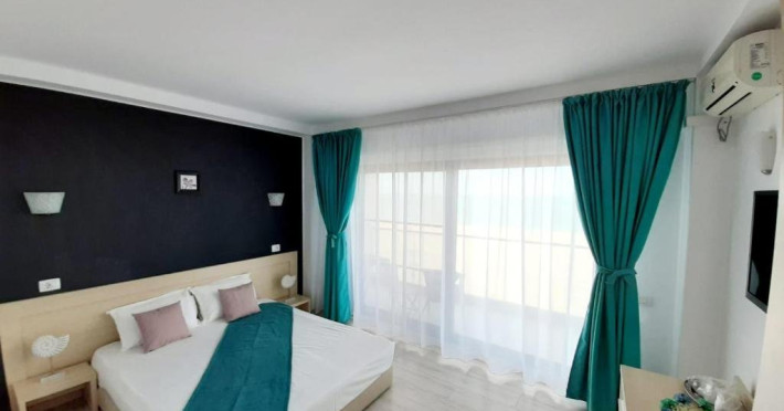 Un Apartament vedere la mare: Are ca suprafata aproximativ 40 45Mp si este format din 2 camere decomandate Living cu canapea extensibila O chicineta cu cuptor microunde, frigider mare, filtru cafea, fierbator, vesela completa - DOAR pentru preparate usoare. NU SE GATESTE Un dormitor spatios cu pat matrimonial O baie spatioasa cu cabina de dus.
