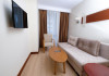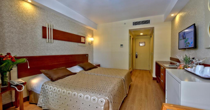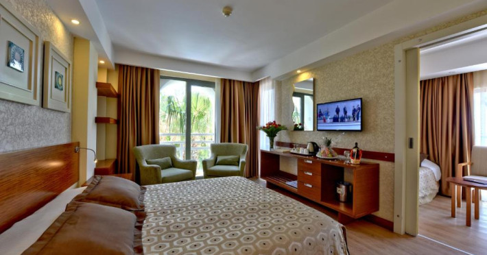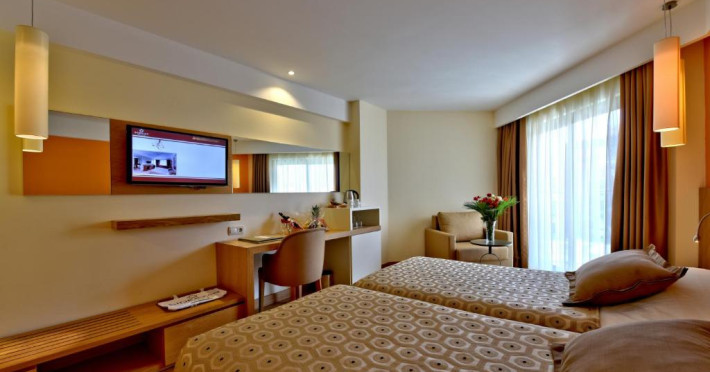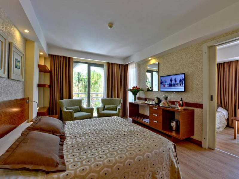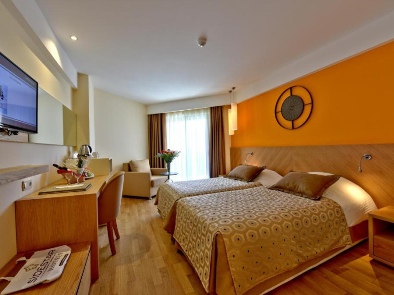 Camerele elegante de la Side Star Beach se deschid spre balcoane private cu vedere la mare sau la piscină. Toate includ TV cu ecran plat cu canale prin satelit si sunt dotate cu podele din lemn.
